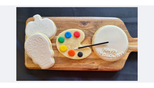 Party Pack- 10 stenciled cookies, 10 paint palette cookies, 10 food grade paint brushes, and 10 resealable bags for taking cookie home or regifting